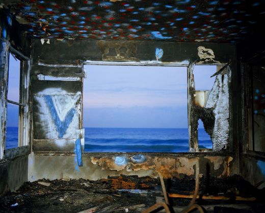 Go to Pomona College and stand in the Zuma room. Fifteen spectacular pigment prints on rag are on display in the main gallery. For “Zuma” (1977-78), Divola returned again and again to photograph inside one ill-fated house on Zuma Beach. The series begins—almost pleasantly, by Divola’s standards— in a recently sacked, off-white room with a view. To balance interior and exterior light, Divola photographed only at sunset or sunrise. The swathe of ocean framed by the windows, blurred because depth of field is so low, seems to float on the walls like a phantasmagoric poster. Over time, unseen participants pick the bones of the house clean. Spray-painted markings appear: bright red on jagged glass, a field of silvery hooks on a wall. The color is sensational. At some point, we’re told, the local fire department swings by for practice sessions. Burnt ruffles of ash creep up the doors, the ceiling darkens. It’s as if the house were the subject of repeated, botched cremations, and the crispier it gets in there, the more rich and florid the textures, the greater Divola’s license. The camera pulls back. Dots of blue and red draw our eye to the ceiling; lashings of silver counterpoint the sea. Here the act of painting is a form of attention, a weird, indefinable communication between the view and the room. From 1974’s “Vandalism” to today’s “Dark Star,” Divola has absorbed facets of any medium his magpie curiosity desires. Painting, drawing, sculpture, conceptual art, performance, and installation—it’s all fair game for his photographic practice. More than anything, he brings to this mash-up a unique and probing awareness of his chosen medium. As art historian David Campany has written of his work, and it bears repeating: “There is nothing quite like this in the history of photography.”